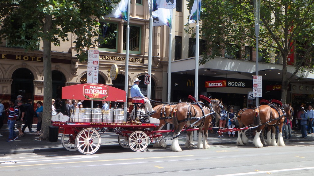 Am Morgen regnet es. Weil die Parkhäuser in der Stadt sündteuer sind (wenn man länger als 3 Stunden parkt: 40 Euro), fahren wir mit der Straßenbahn in die City. Dafür müssen wir zunächst wieder eine Plastikkarte kaufen und Geld aufladen. Gleiches Prinzip wie in Brisbane, nur dass die Dinger hier Myki heißen. 20 Minuten laufen wir bis zur Tram-Station, müssen dann aber ewig (20 statt 2 Minuten) warten, bis die Bahn kommt. Offenbar sind zwei Züge ausgefallen. Die Tram braucht 45 Minuten ins Stadtzentrum und hält auf der vielleicht 8 km langen Strecke 44 mal! Das Ding steht mehr, als dass es fährt. Zwischen den Haltestellen liegen nicht mal 200 Meter, manchmal auch nur 100. Macht einen ganz narrisch. Zwei Drittel der Haltestellen könnte man m.E. locker auflösen.